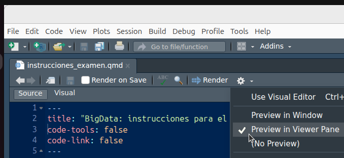 .qmdcon tus respuestas al examen, el resultado se visualice en la “Viewer Pane”, y no se te abra en el navegador. Para ello has de: